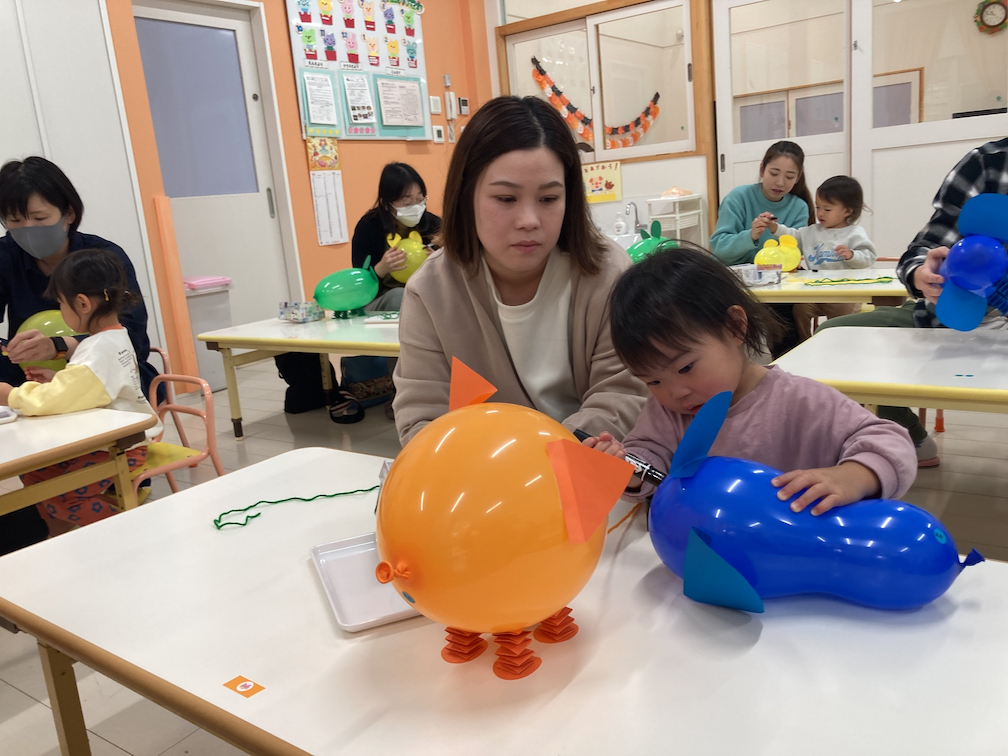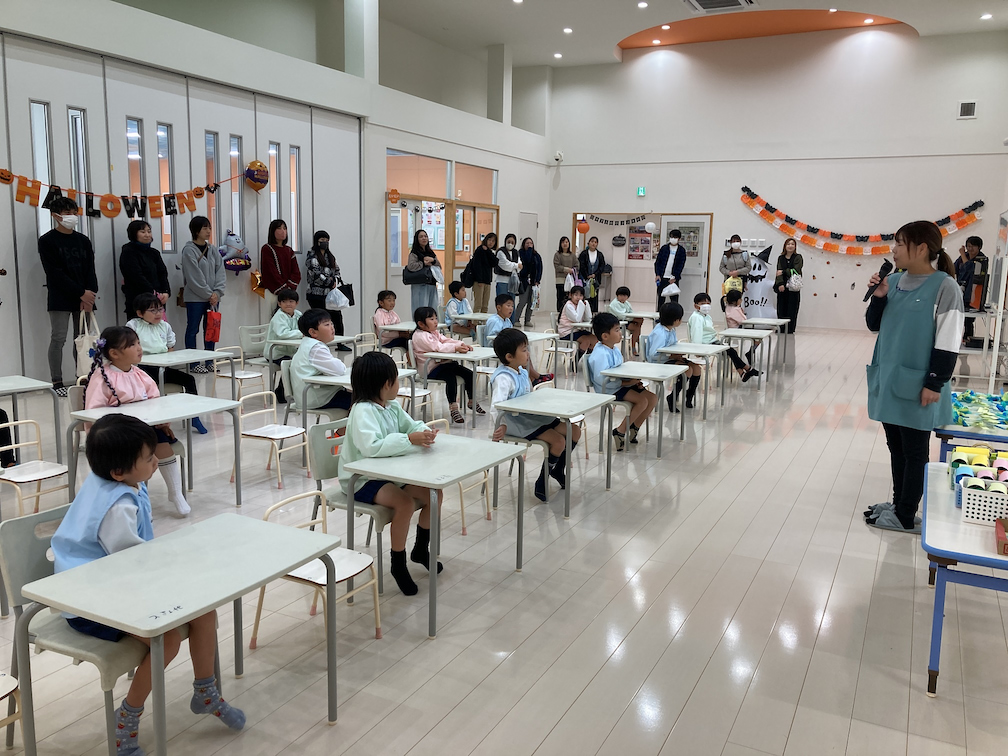 保育参観・給食試食会を行いました(2歳児・5歳児) 2025年10月31日(金) 保育参観・給食試食会を行いました。(2歳児・5歳児)2歳児は親子で風船ペットを製作し、マントをつけて散歩を楽しみました。お家の人と一緒に完成すことができ、大満足の子どもたちでした。給食試食会では、満面の笑顔で給食を食べていました。5歳児は、シイタケの植菌、モンスターバック製作を行いハロウィンパーティーを楽しみました。ハロウィンパーティーでは「トリックオアトリート!」言うと、お家の人からサプライズのお菓子のプレゼントがあり、嬉しそうにバックの中に入れていました。思い出に残る1日になりました。