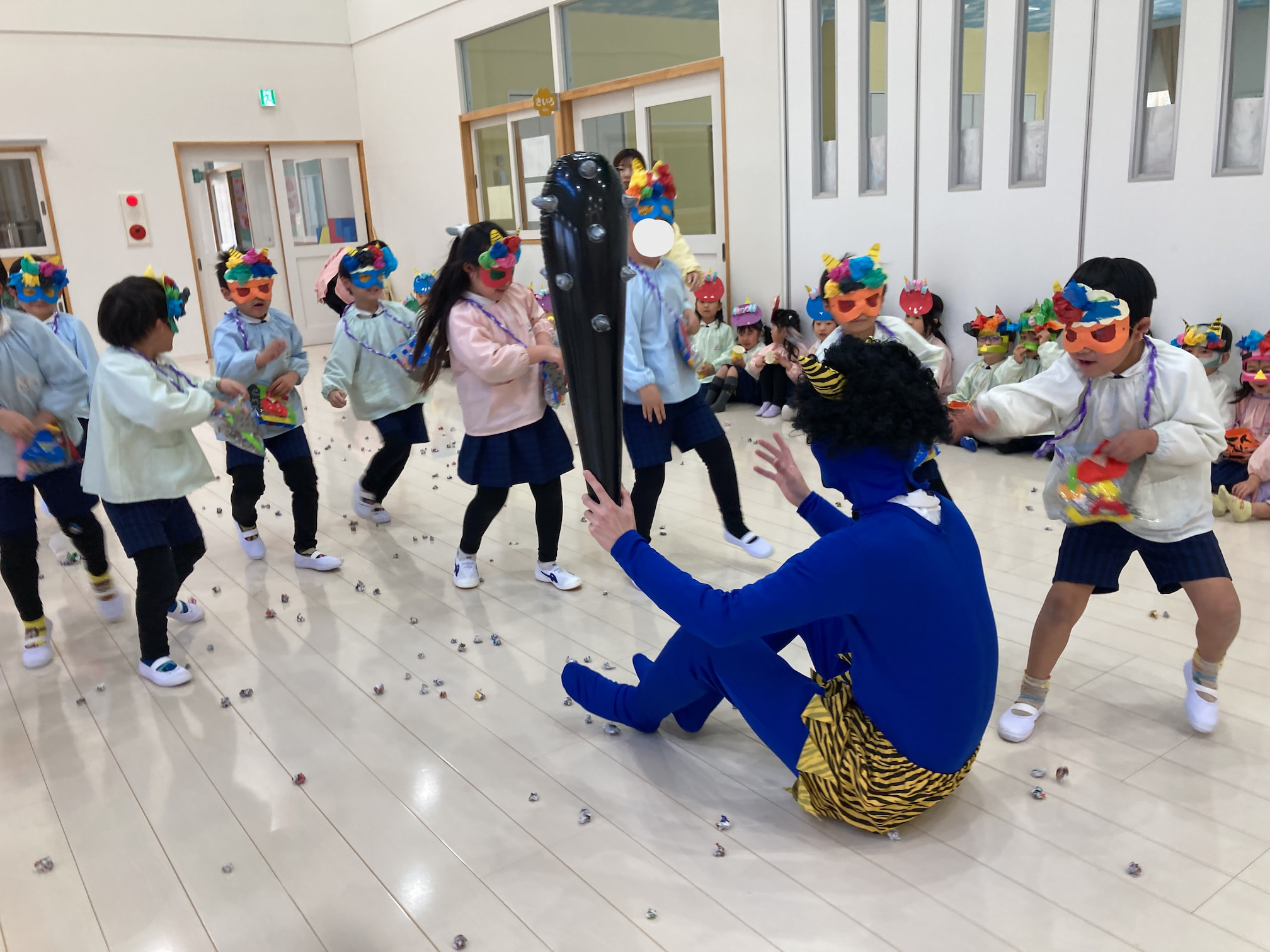 豆まき会を行いました 2026年2月3日(火) 豆まき会を行いました。 こども園では元気に豆まきを行いました。節分の由来を聞いたり、クイズをしたりしていると鬼が登場!怖くて泣いてしまう子もいましたが、「鬼は外!福は内!」と大きな掛け声と一緒に手作りの豆を投げていました。最後には鬼と仲直りをし、一緒に記念撮影をして思い出に残る豆まき会になりました。