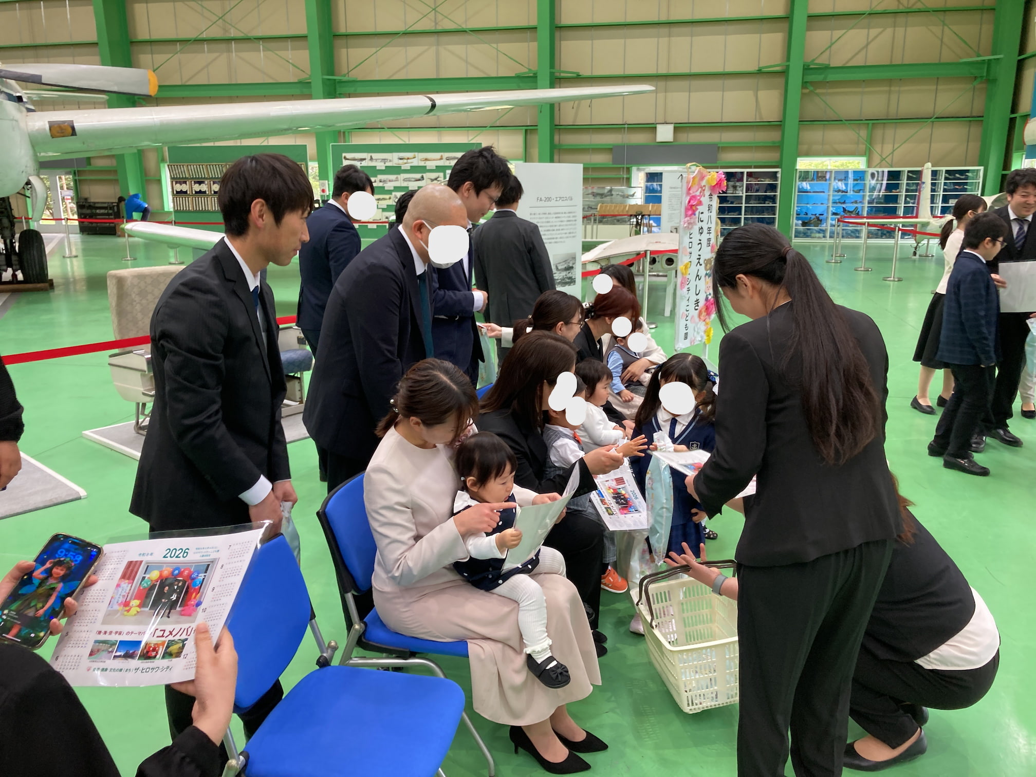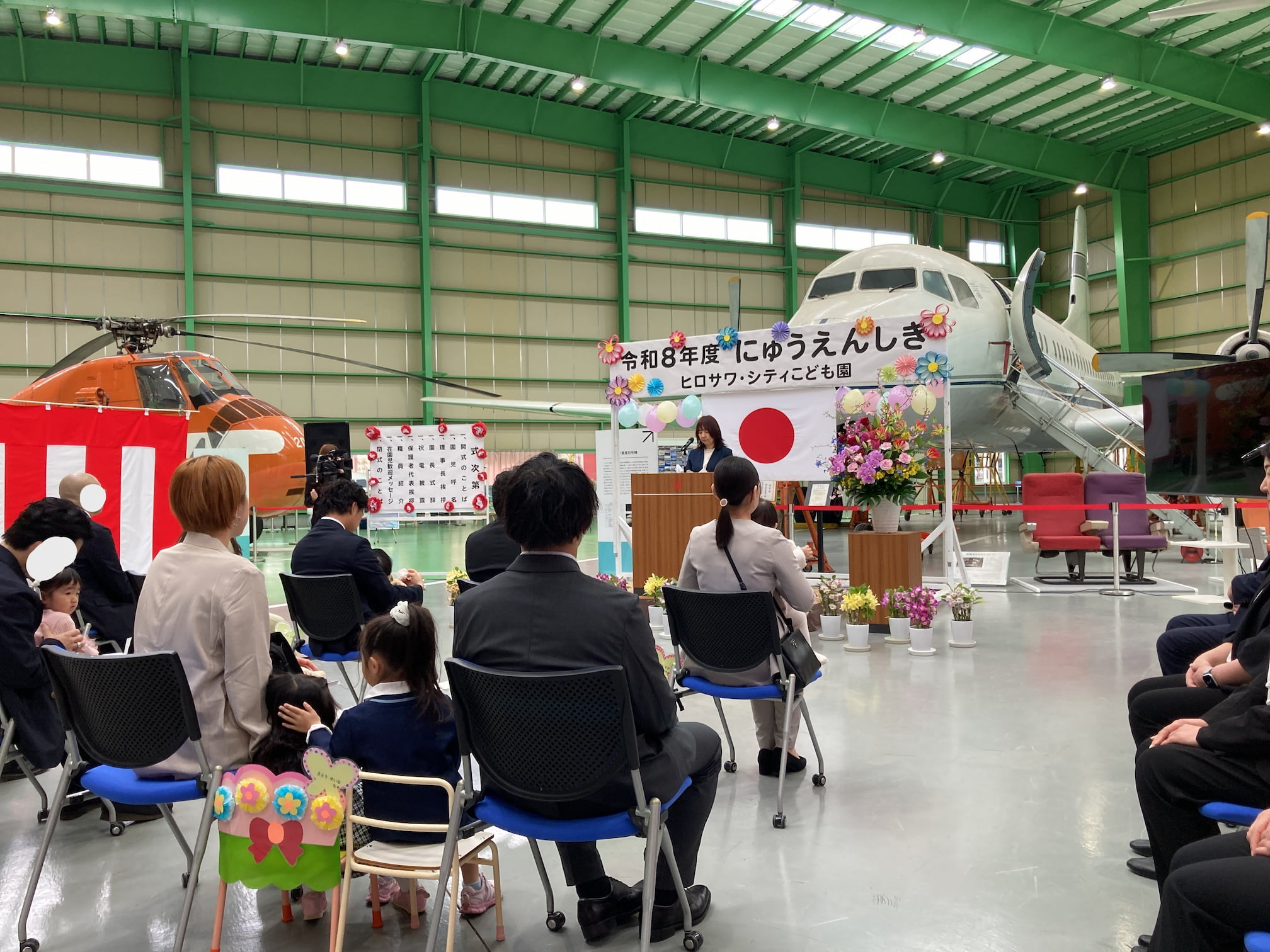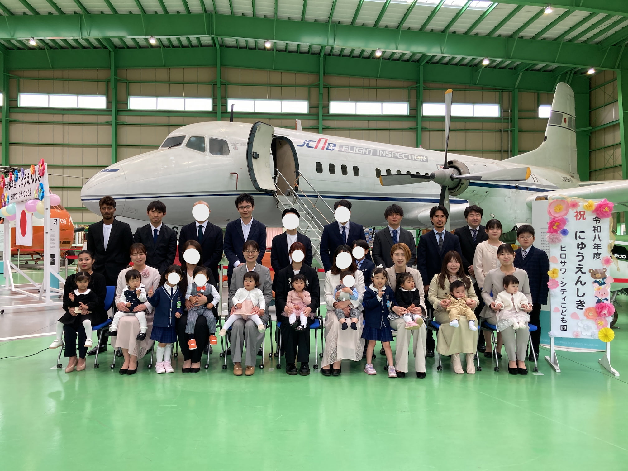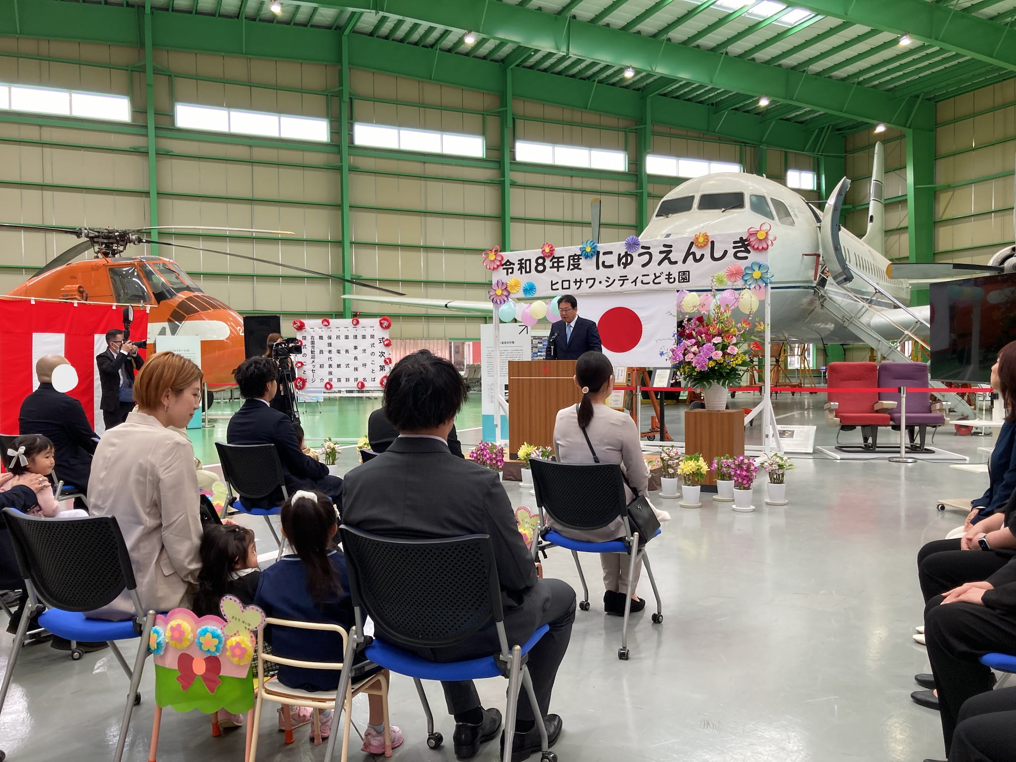 入園式を行いました 2026年4月4日(土) 入園式を行いました。 満開の桜のもと、無事に入園式を執り行うことができました。初めての場所で緊張気味の子どもたちでしたが、ユメノバの大きな飛行機やぬいぐるみを見ると、安心して少しずつ笑顔もみられました。これからお友だちや先生と楽しい毎日を過ごしましょうね。