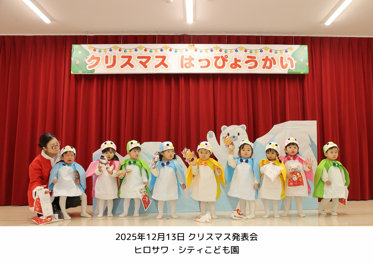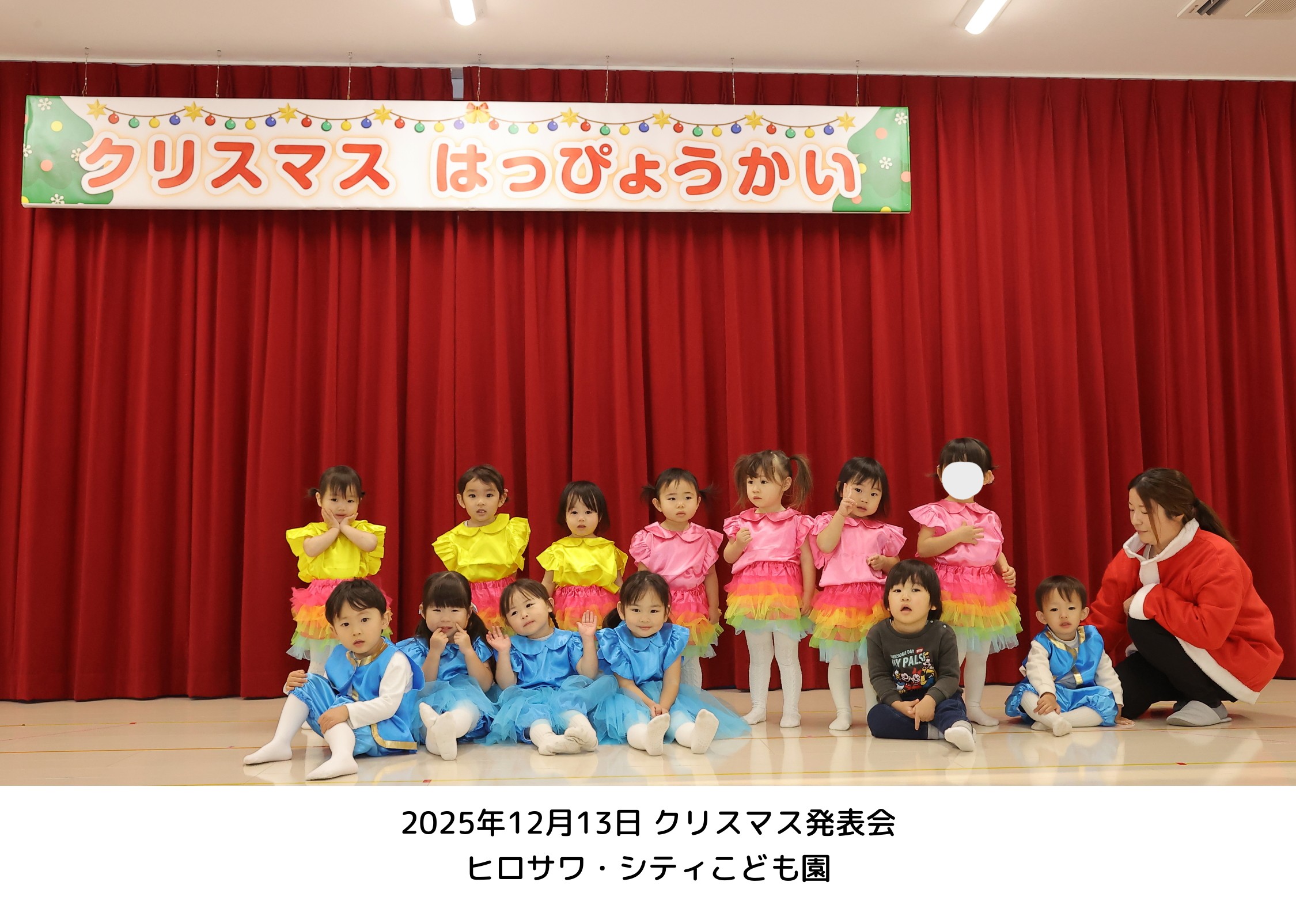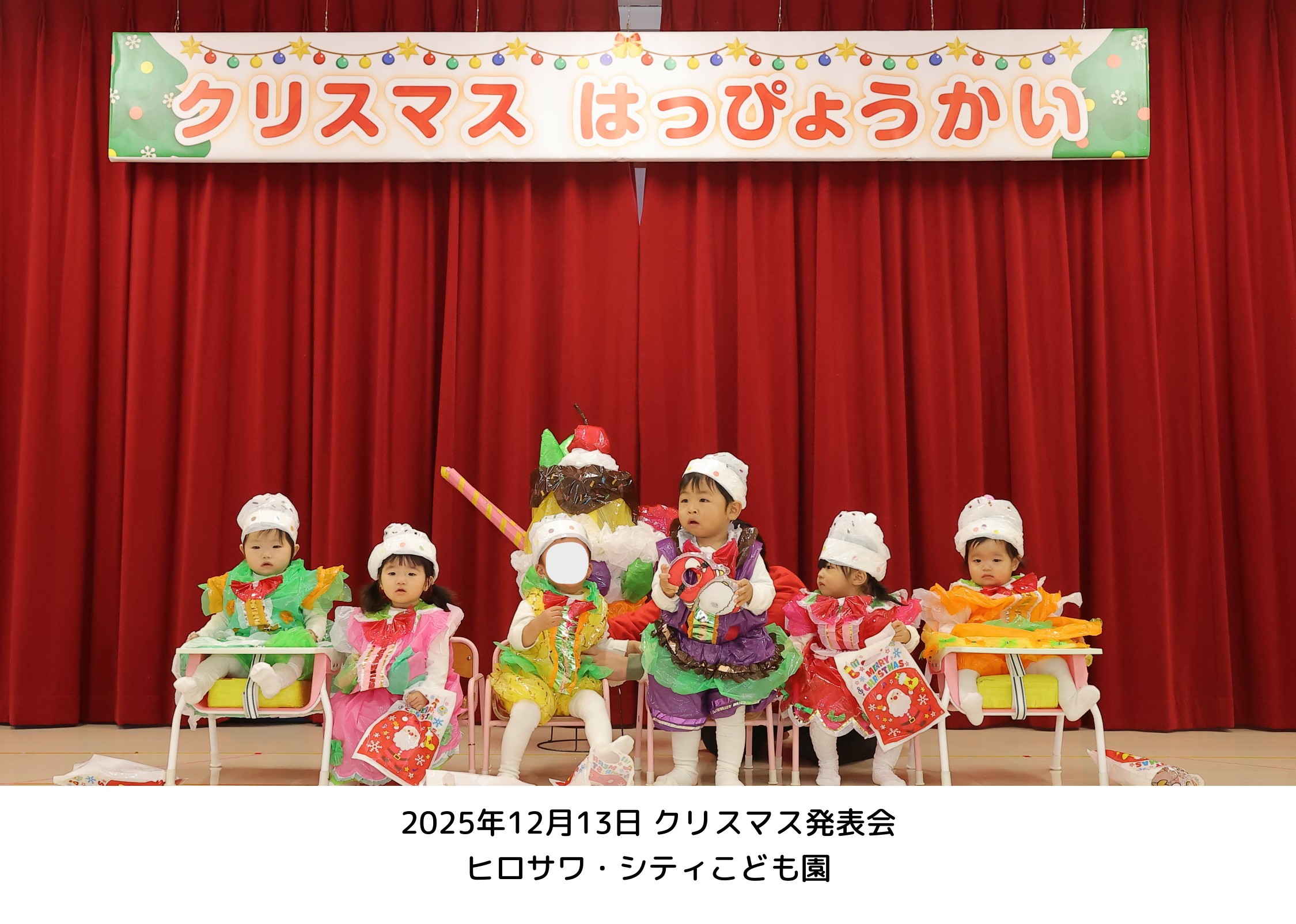 クリスマス発表会を行いました 2025年12月13日(土) クリスマス発表会を行いました。各クラス発表会に向けてたくさん練習を重ね、保護者の皆様に見てもらうのを楽しみにしていました。本番では緊張してしまう子もいましたが、かわいい衣装を着て踊ったり演技したりと、生き生きとした姿が見られました。最後にはプレゼントとケーキをもらい、楽しいクリスマス発表会になりました。