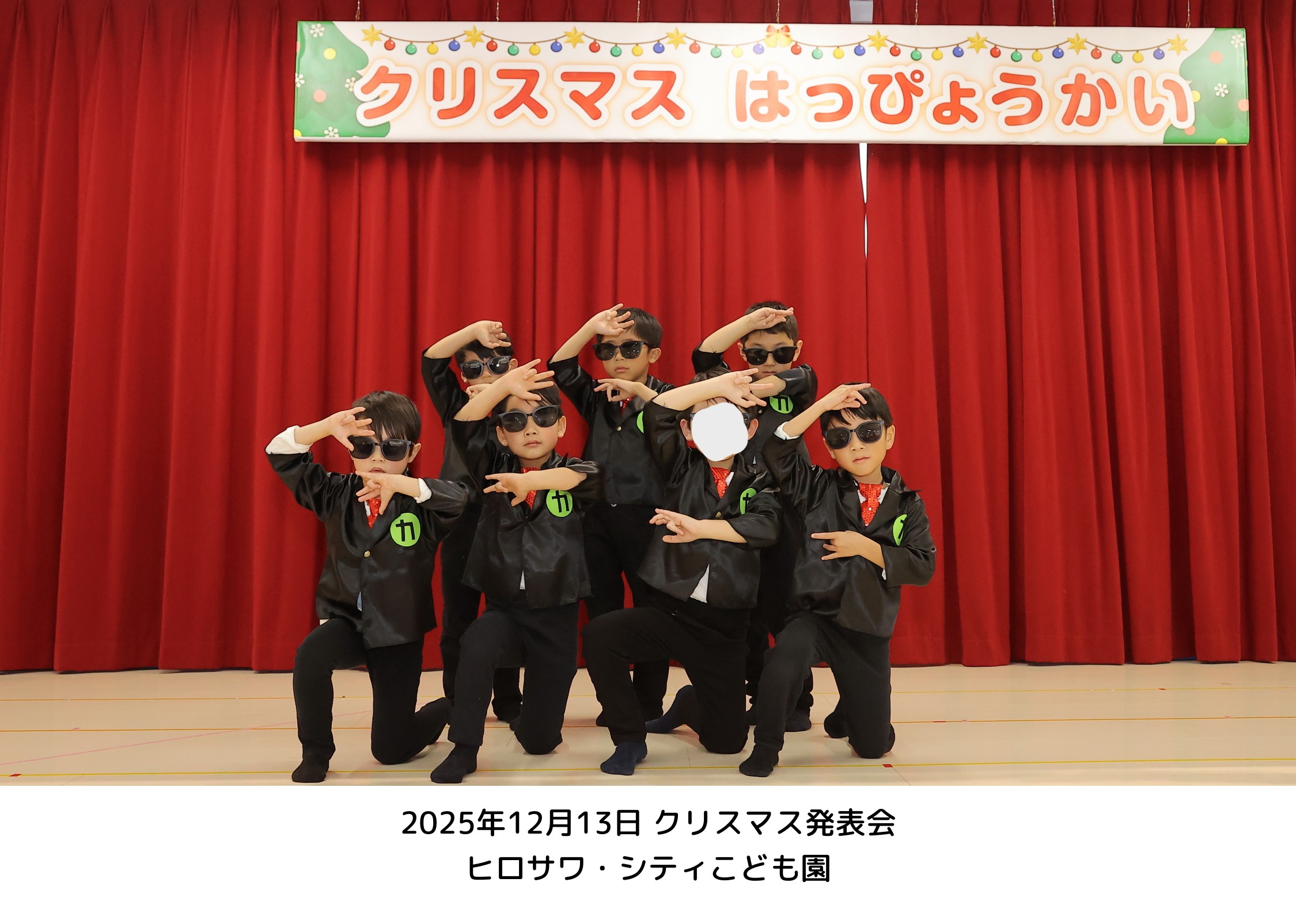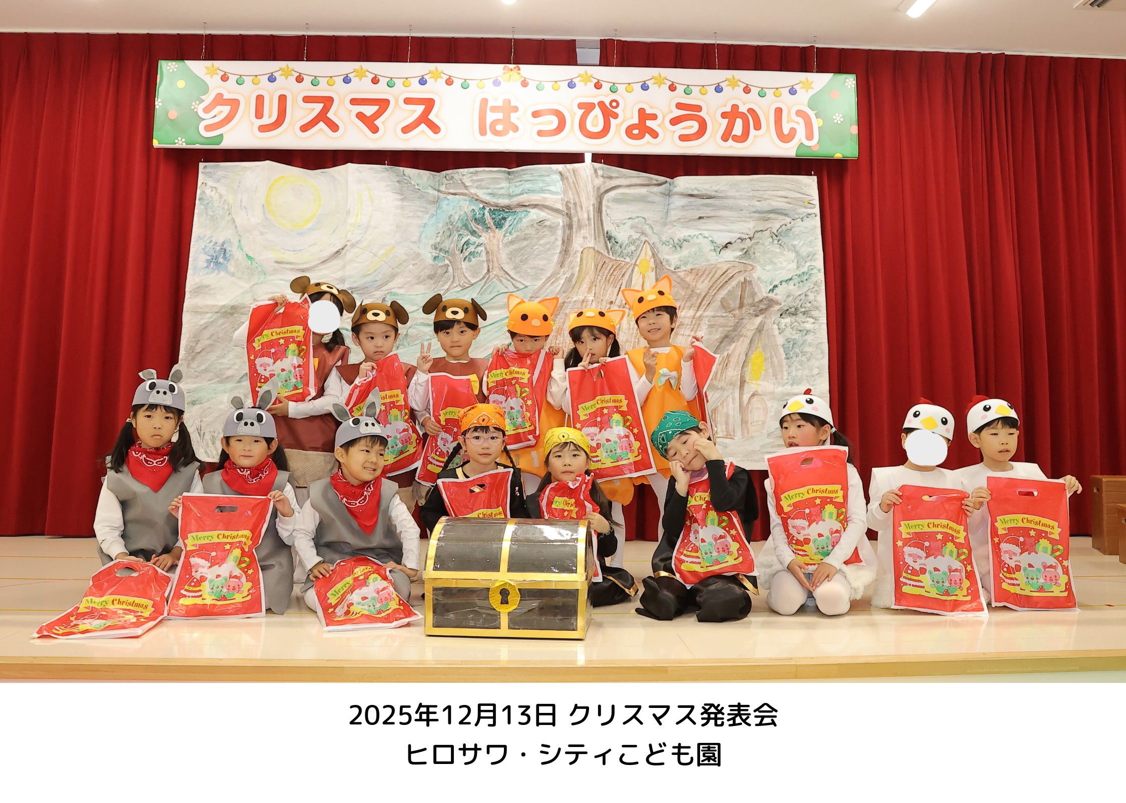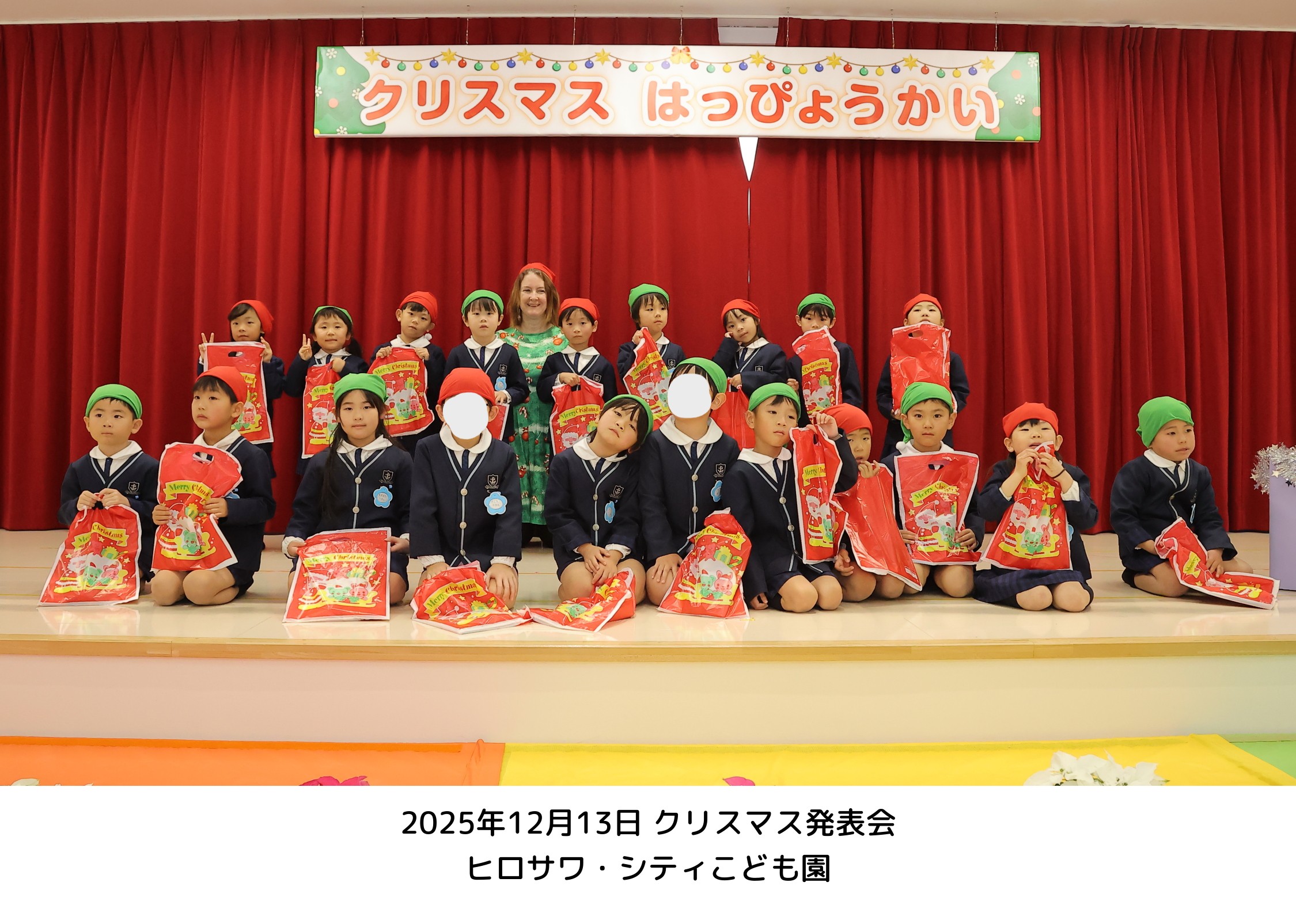 クリスマス発表会を行いました 2025年12月13日(土) クリスマス発表会を行いました。各クラス発表会に向けてたくさん練習を重ね、保護者の皆様に見てもらうのを楽しみにしていました。本番では緊張してしまう子もいましたが、かわいい衣装を着て踊ったり演技したりと、生き生きとした姿が見られました。最後にはプレゼントとケーキをもらい、楽しいクリスマス発表会になりました。