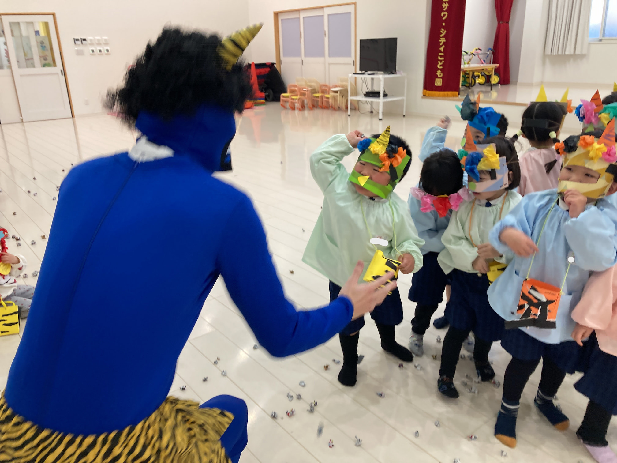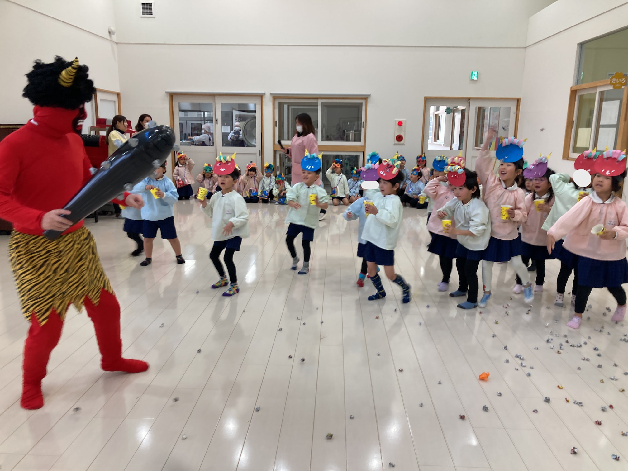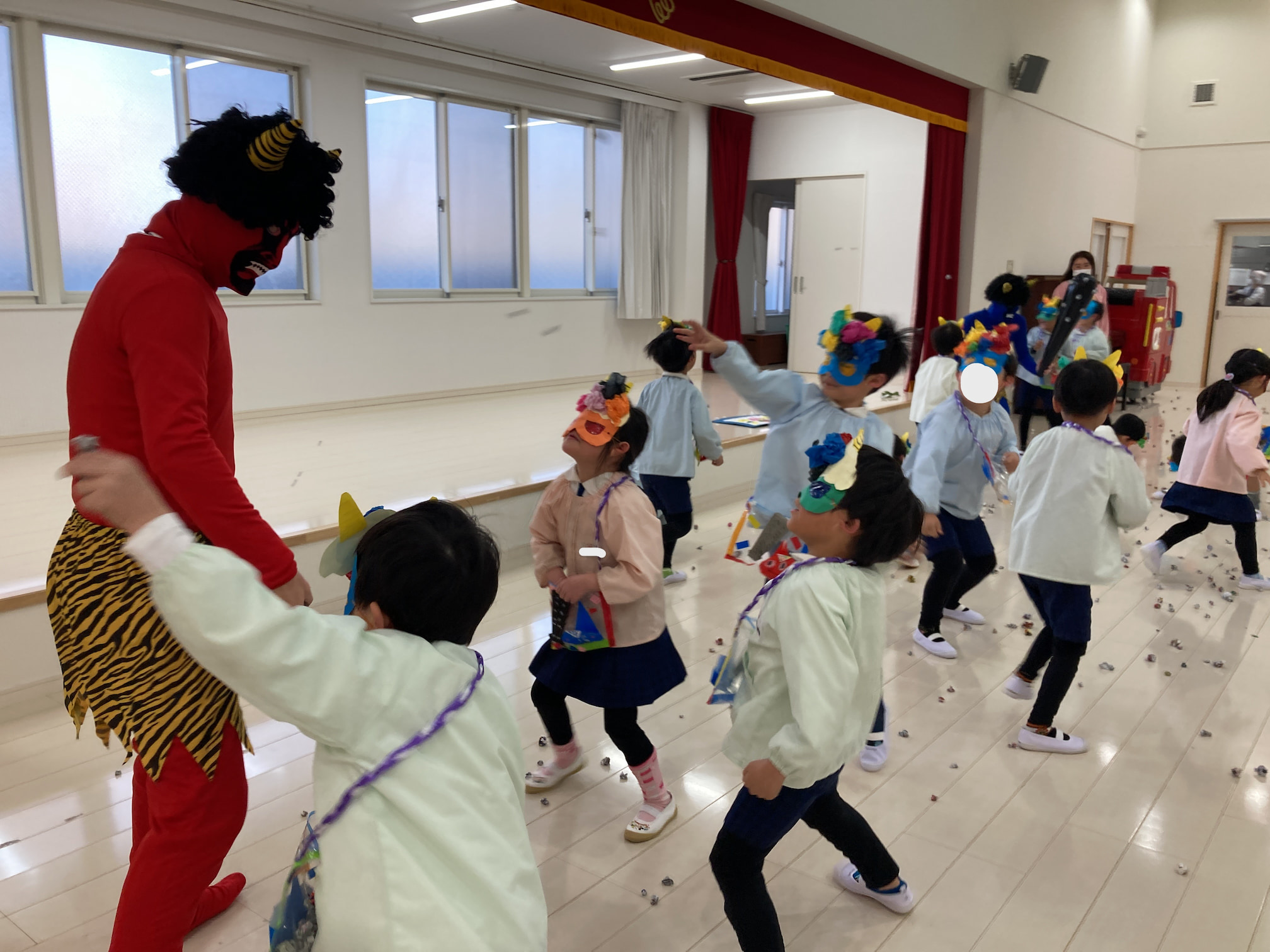 豆まき会を行いました 2026年2月3日(火) 豆まき会を行いました。 こども園では元気に豆まきを行いました。節分の由来を聞いたり、クイズをしたりしていると鬼が登場!怖くて泣いてしまう子もいましたが、「鬼は外!福は内!」と大きな掛け声と一緒に手作りの豆を投げていました。最後には鬼と仲直りをし、一緒に記念撮影をして思い出に残る豆まき会になりました。