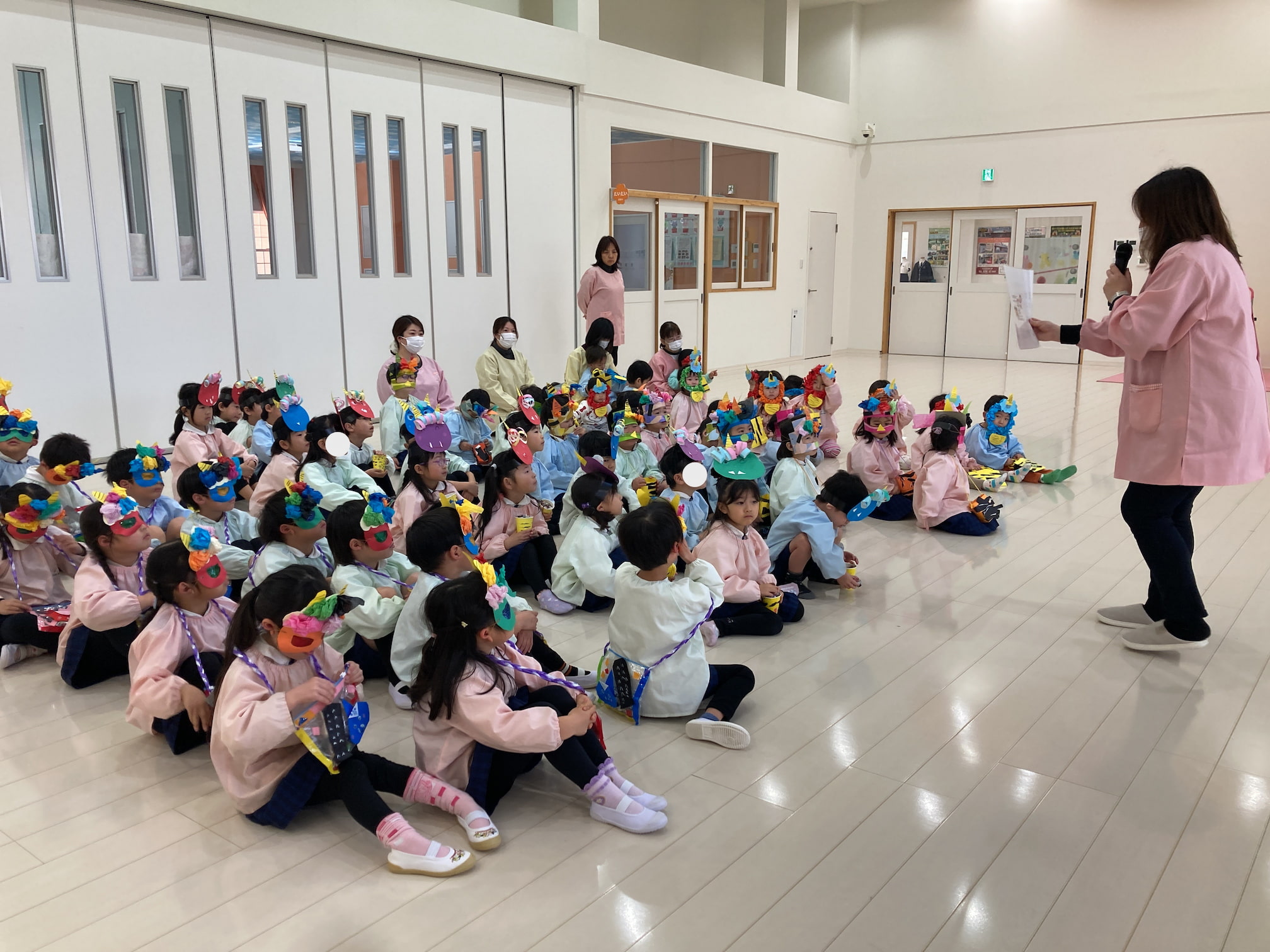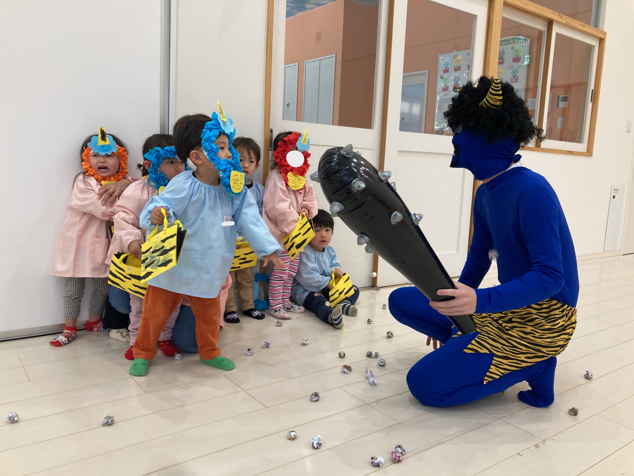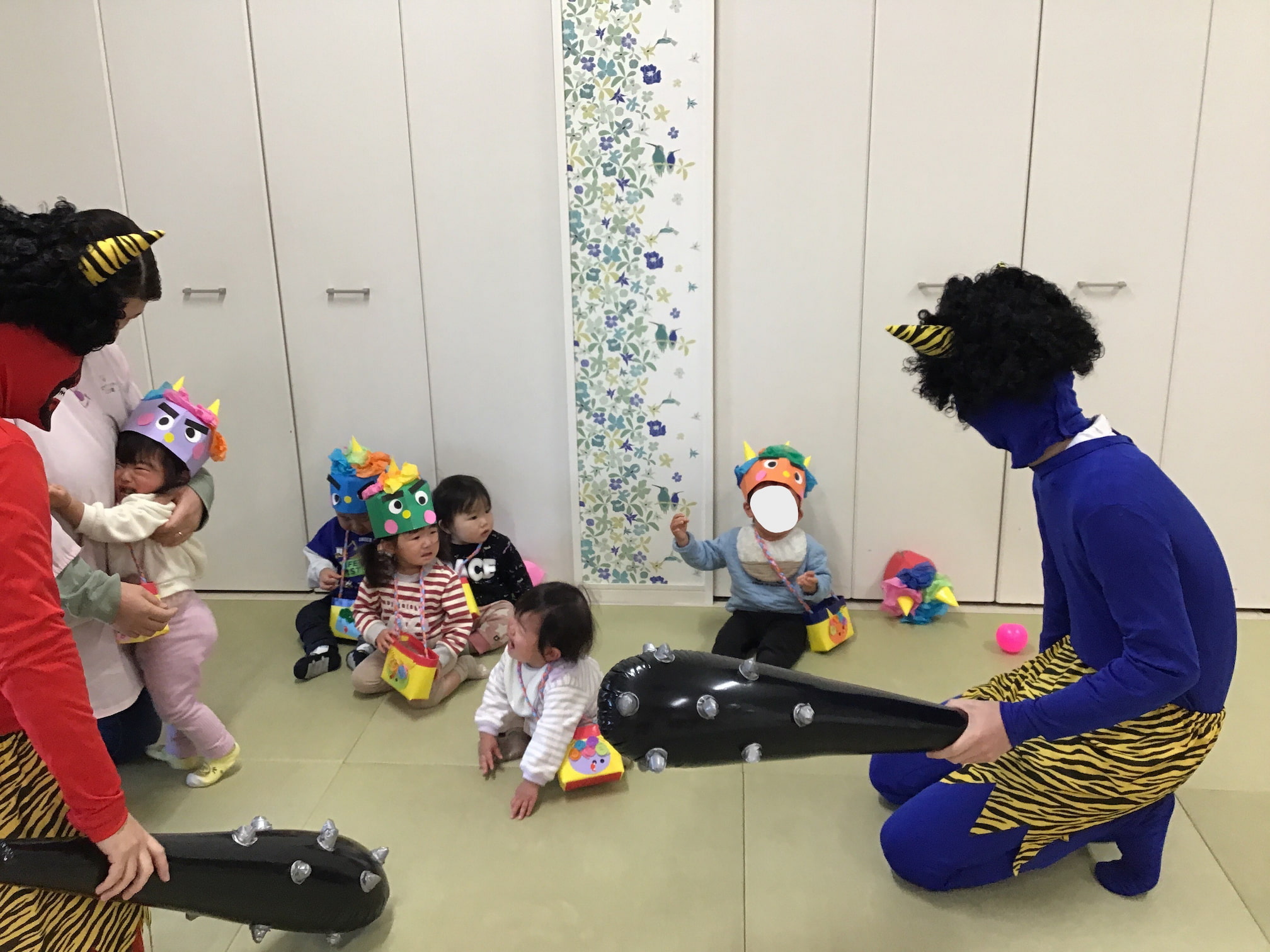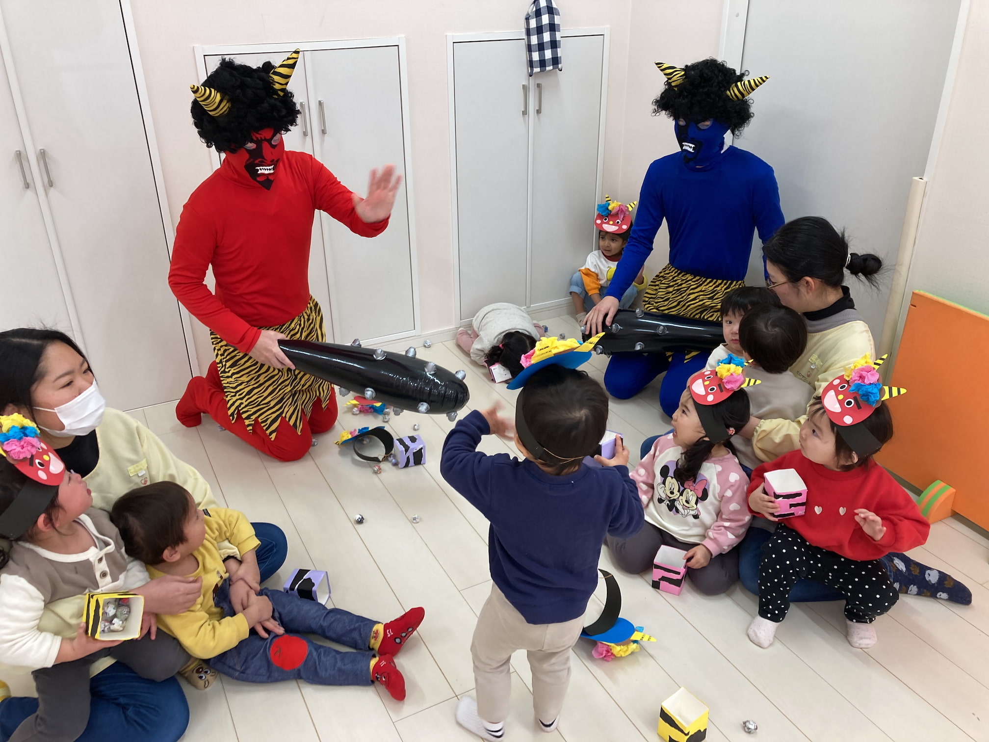 豆まき会を行いました 2026年2月3日(火) 豆まき会を行いました。 こども園では元気に豆まきを行いました。節分の由来を聞いたり、クイズをしたりしていると鬼が登場!怖くて泣いてしまう子もいましたが、「鬼は外!福は内!」と大きな掛け声と一緒に手作りの豆を投げていました。最後には鬼と仲直りをし、一緒に記念撮影をして思い出に残る豆まき会になりました。